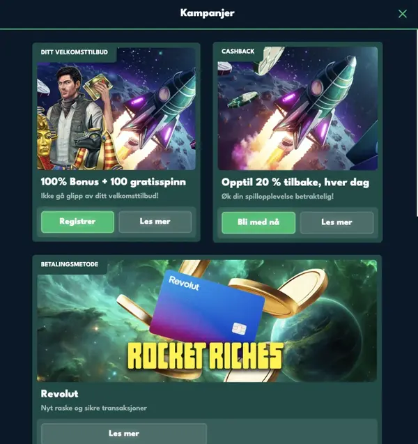 RocketRiches-bonus-tilbud kan endre seg, sÄ vi anbefaler Ä sjekke kampanjeomrÄdet fÞr du setter inn. Hvis du ser en hent-knapp, kan du ogsÄ lese vilkÄrene fÞr du bekrefter. RocketRiches holder denne informasjonen inne i kontoen din, slik at den er enkel Ä finne igjen senere.